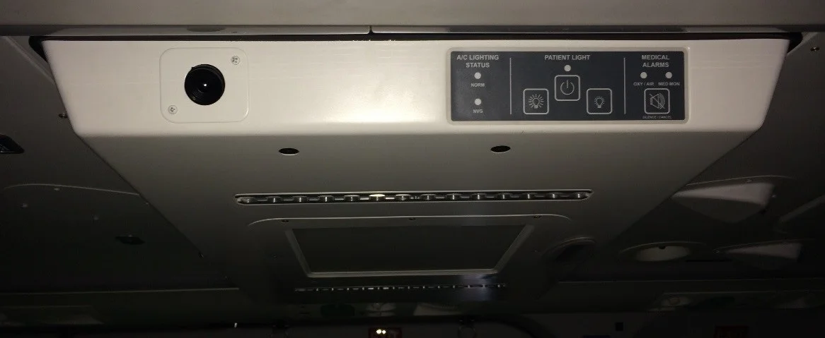 The Aeromedical Fitout also contains a Ceiling Service Unit (CSU) mounted in the centre of the passenger cabin ceiling which provides oxygen, air and electrical outlets, lighting provisions, medical radio heads and provides the capacity to mount a piece of medical monitoring equipment.
